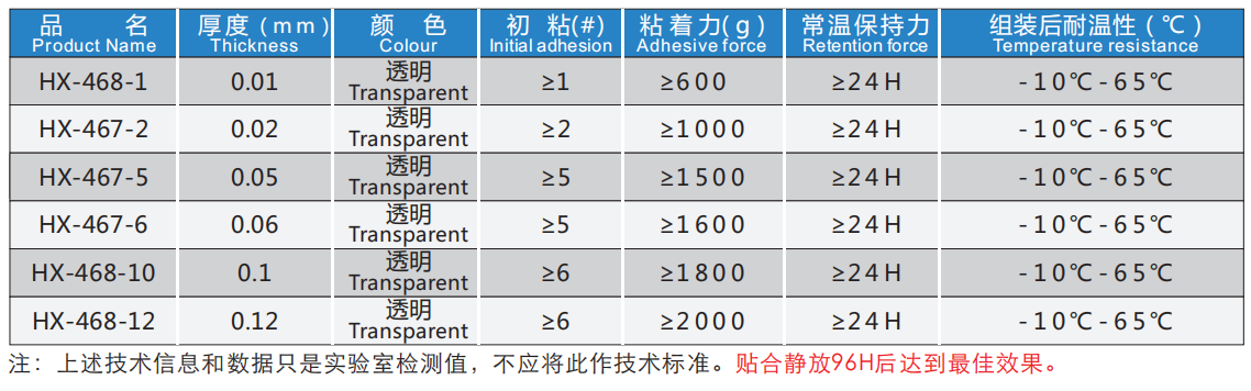 贺兴无基材双面胶由丙烯酸胶黏剂涂布 、再附上聚合物涂层的白色离型纸或透明的PET生产而成 ,在高湿 环境中不会打皱 。适用于电子 ,电器 ,皮料粘接 。 常规生产0.01 -0. 13m m ,其他规格可按需定制。
